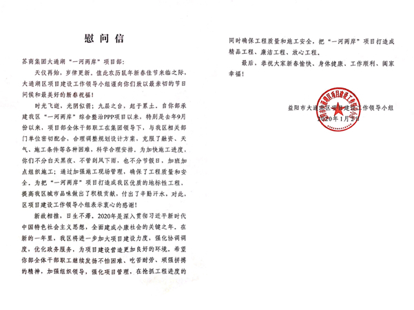 1月3日,苏商第十建设集团承建的湖南省益阳市大通区“一河两岸”综合整治PPP项目收到当地业主单位发来的感谢信。