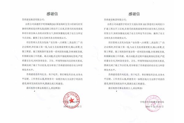12月21日,苏商建设第八集团承建的宁明项目分别收到来自广西宁明县住建局、交通局的感谢信。信中对集团在项目建设中的出色表现和突出成绩给予肯定,并深表感谢。